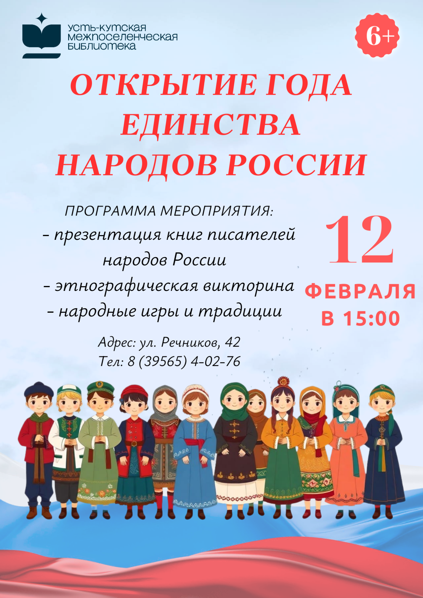 Дорогие друзья, приглашаем вас 12 февраля в 15:00 в нашу библиотеку на открытие Года единства народов. Именно здесь, в библиотеке, встречаются различные языки и литература, культурные традиции и богатая история. Приходите, будет интересно!